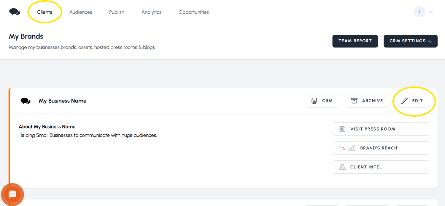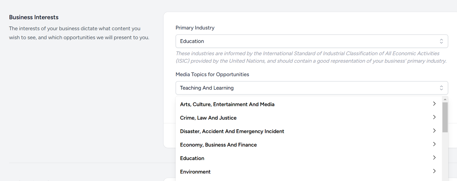 - Clients: This is your area for managing your Business Profile. In this section, you can add details about the company, edit your press room and choose your Industry and Topics of Interest for suggested media requests.