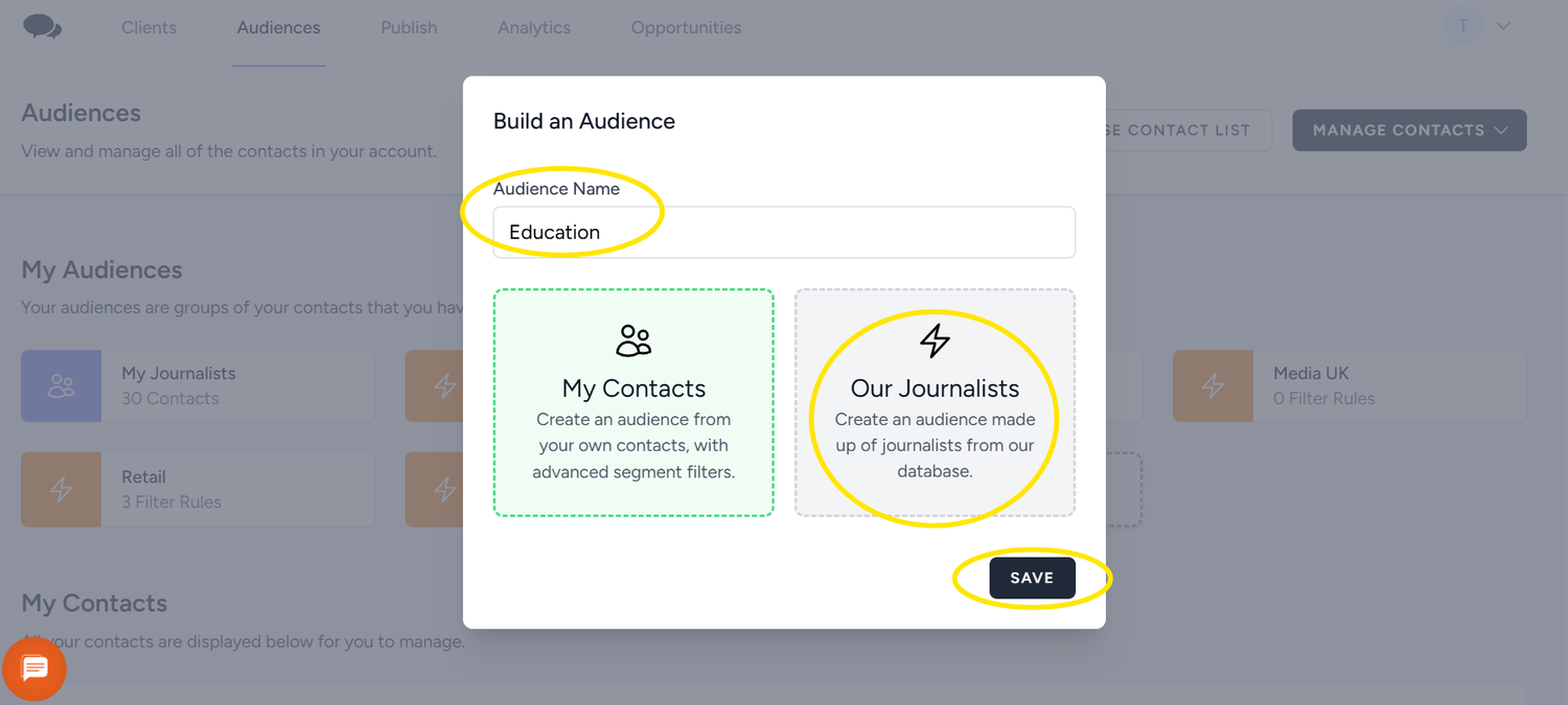 Give your audience a name and click on 'Our Journalists' if you just want to define the audience for JournoLink contacts, or click on 'My Contacts' if you want to segment any contacts that you uploaded.