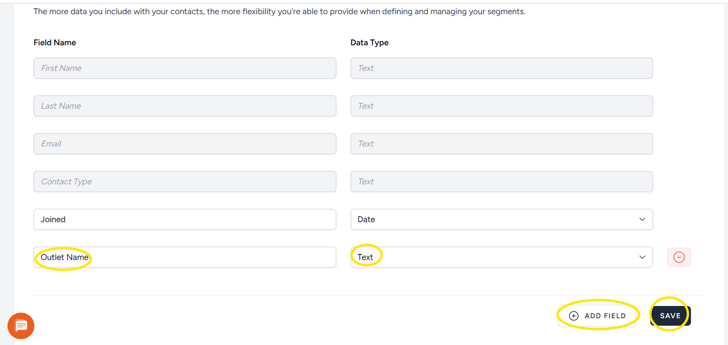 Then you can add the new fields. These will be the same as the headings of your CSV file. For example, if you have telephone numbers or Outlet names in the list you want to upload, you need to create them as fields in the platform first to match with your spreadsheet.